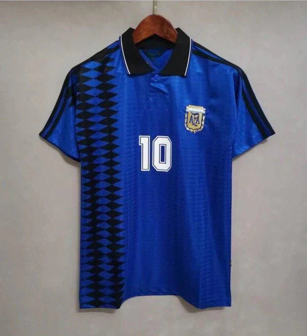 The Argentina 1994 away kit, made by Adidas, is a striking royal blue jersey worn during the 1994 FIFA World Cup in the USA. It features a white V-neck collar with black trim, complemented by the iconic Adidas three stripes on the shoulders. The AFA crest is prominently displayed on the chest, and the number design is bold and classic. Most famously worn by Diego Maradona during his final World Cup appearance, this kit is remembered for its sharp look and historic moments on the pitch.