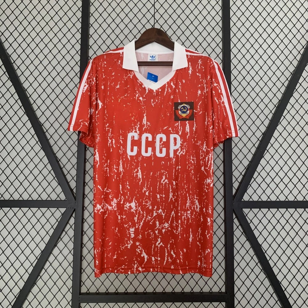 The 1990 CCCP home kit, designed by Adidas, featured a striking red base with a unique white geometric pattern across the fabric, giving it a distinctive and dynamic look. The bold "CCCP" lettering remained across the chest in white, maintaining the Soviet identity. Adidas' signature three white stripes ran along the shoulders, and the jersey had a white V-neck collar with red trim. Worn during the 1990 World Cup in Italy, this kit was the last ever worn by the Soviet Union before its dissolution, making it a historic piece of football memorabilia.