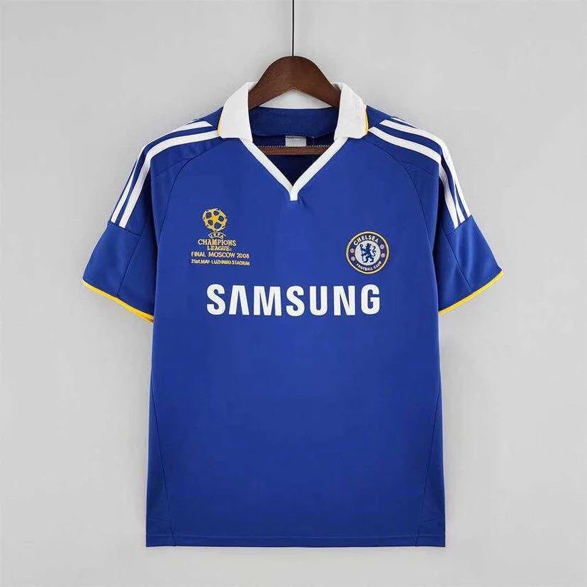 Chelsea's 2008 UEFA Champions League final shirt features a classic blue design with white Adidas stripes, a white collar, and yellow sleeve accents. It includes the Samsung sponsor, the Chelsea crest, and special embroidery marking the Moscow final against Manchester United.