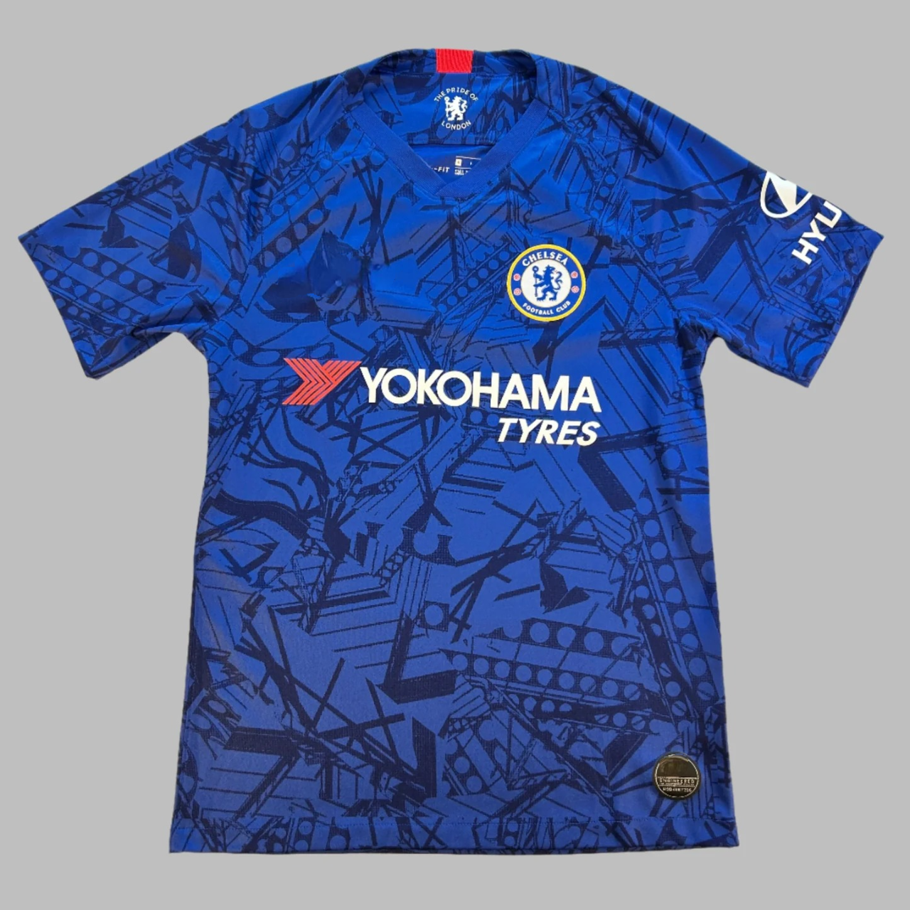 The Chelsea 2019/20 home kit, designed by Nike, features a bold and modern take on the club’s traditional blue. Inspired by Stamford Bridge, the jersey has an abstract graphic pattern across the fabric, mimicking the stadium’s architecture. It has a round collar with red and white trim, adding a classic touch. The Yokohama Tyres sponsor is displayed across the chest, while the Nike swoosh and Chelsea crest complete the look.
