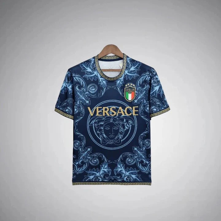 The Italy 2022/23 Special Edition Versace Blue Shirt, designed by Puma in collaboration with Versace, features a deep royal blue base with gold baroque patterns, reflecting Italy’s rich fashion and football heritage. The gold Puma logo and FIGC crest add a premium touch, making this a standout fusion of luxury and sport. A rare collector’s piece, this jersey embodies Azzurri elegance with a high-fashion twist.