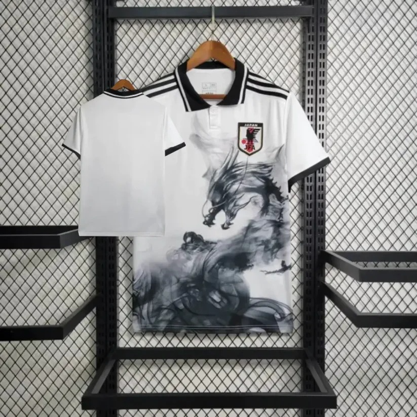 The Japan 2023/24 Dragon Special Edition Shirt, designed by Adidas, features a sleek white base with a striking black dragon graphic inspired by traditional Japanese ink painting. The black collar and Adidas stripes add contrast, while the JFA crest stands proudly on the chest. This unique design blends Japanese culture and football, making it a must-have for collectors and Samurai Blue fans alike.