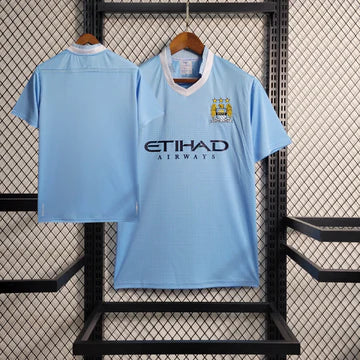 The Manchester City 2011/12 home kit, made by Umbro, features a classic sky blue design with a subtle checkerboard pattern woven into the fabric. The black trim on the collar and sleeves adds a sharp contrast, while the Etihad Airways sponsor is displayed across the chest. This iconic jersey was worn during City’s historic Premier League-winning season, with Sergio Agüero’s legendary last-minute goal sealing their first league title in 44 years.