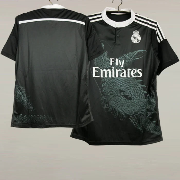 The 2014-15 Real Madrid third kit, designed by Adidas, featured a bold black color with a unique dragon graphic designed by Japanese artist Yohji Yamamoto. The kit had white accents, including the Adidas stripes and sponsor logo, and was paired with black shorts and socks. The dragon symbolized strength and power, making it one of the most iconic and stylish third kits in Real Madrid’s history.