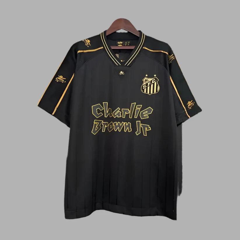 The Santos x Charlie Brown Jr. 2024 special edition jersey, made by Umbro, features a black base with subtle varnished stripes and gold accents in tribute to the legendary Brazilian rock band. Inspired by skate culture, the design includes skateboard motifs and a special stamp with lyrics, celebrating the band's deep connection to Santos.